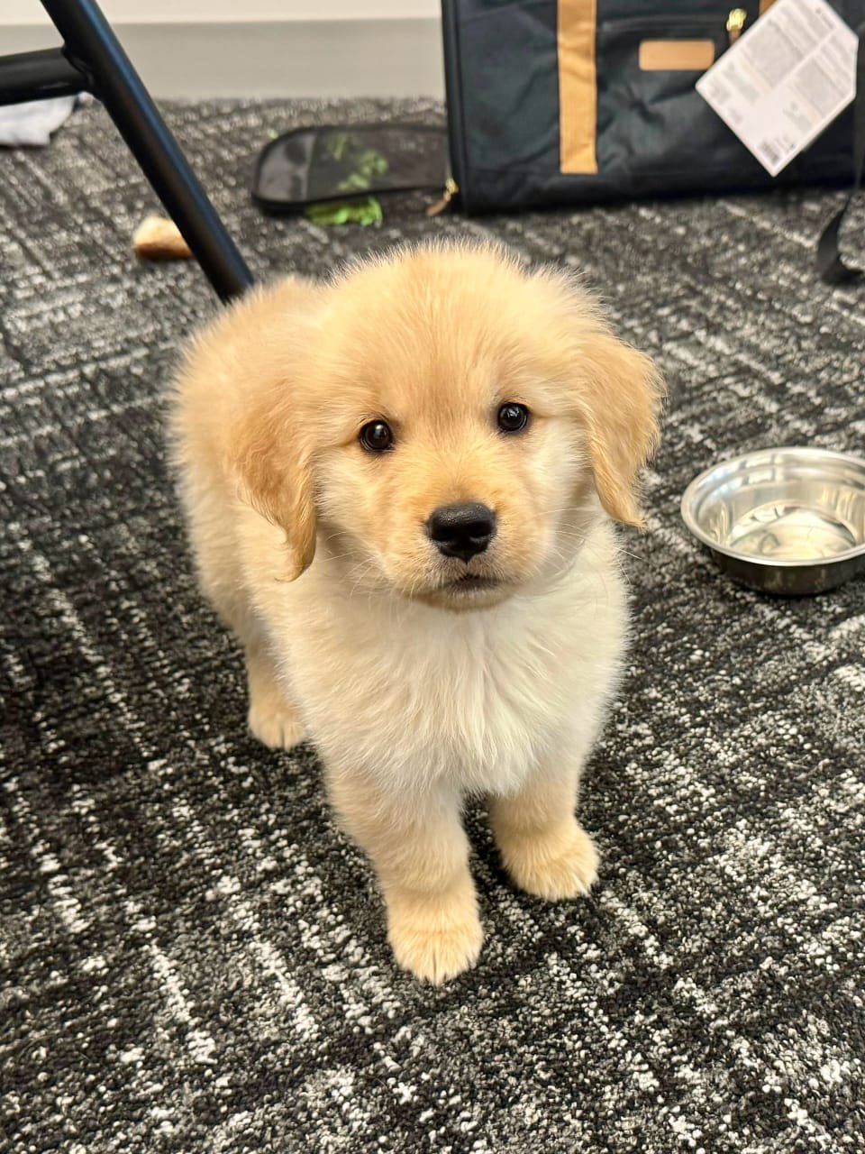 Puppy flies in cabin with a trained, licensed puppy chaperone.